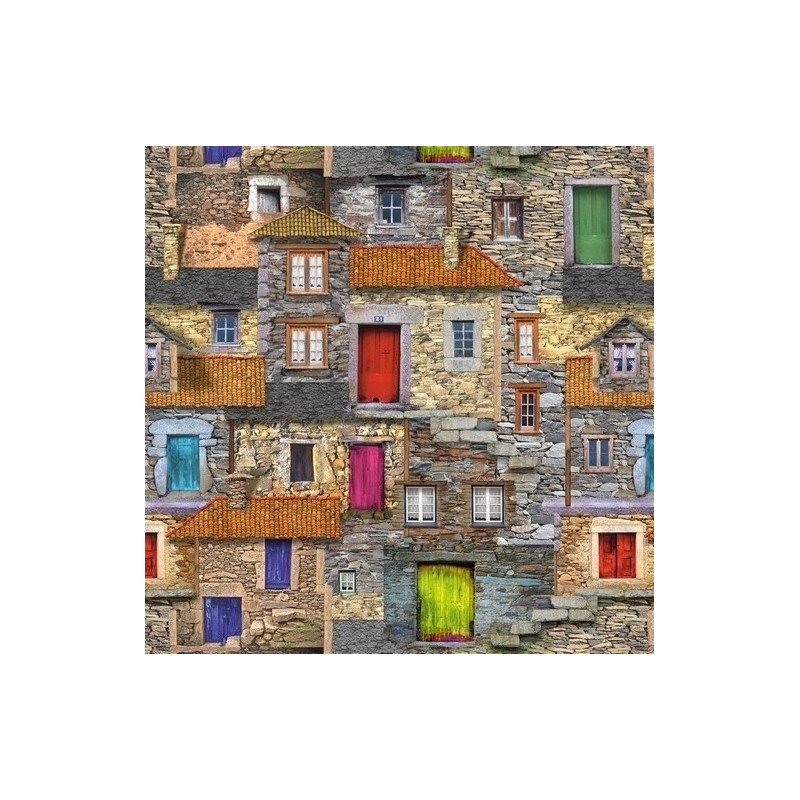 917 321 358**Tecido estampado em half-panamá de algodão de dupla largura com imagens das casas tradicionais das aldeias de xisto portuguesas.