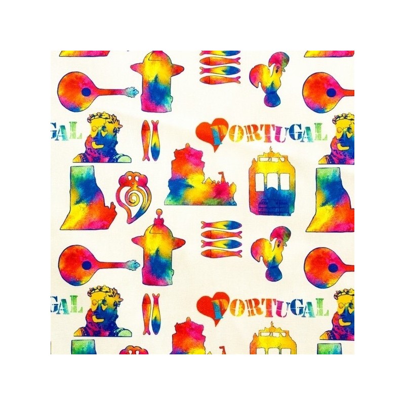 917 321 358**Tecido de estampagem digital em half-panamá de algodão com alguns ícones de Portugal.