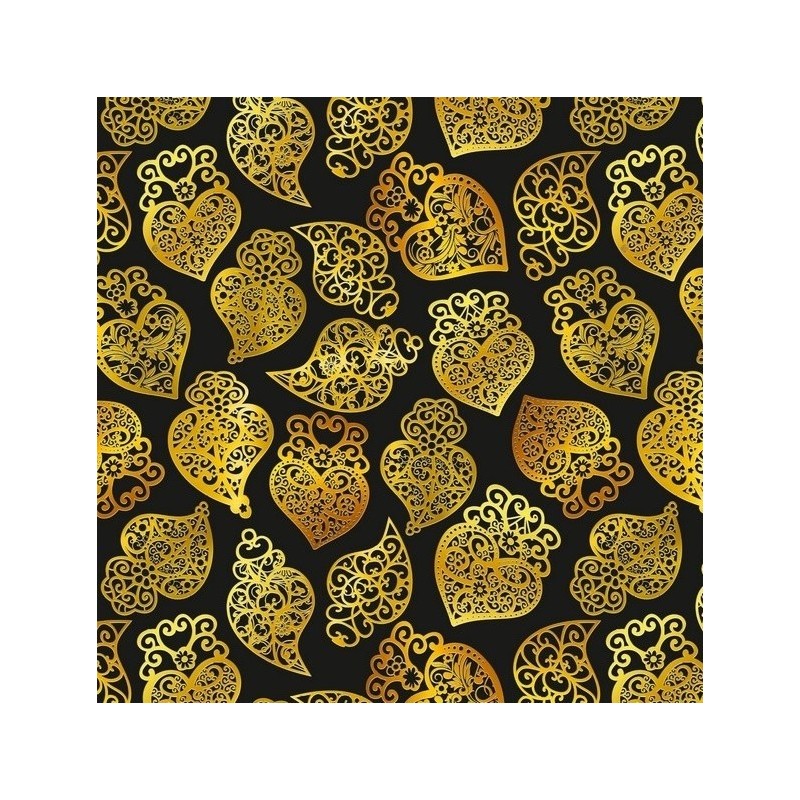 917 321 358**Tecido de estampagem digital de dupla largura com a representação dos corações de Viana dourados em filigrana com fundo preto. Preço indicado corresponde a uma parcela de 25 cm de comprimento.