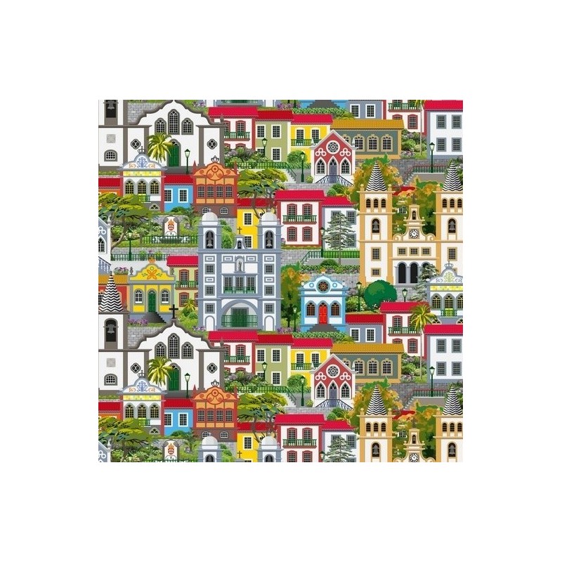 917 321 358**Tecido de estampagem digital de dupla largura inspirado no Arquipélago dos Açores e nas fachadas típicas das suas casas, igrejas e impérios.