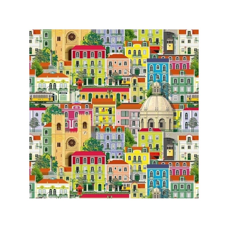 917 321 358**Tecido em half panamá de algodão inspirado em Lisboa e nas fachadas das suas casas, monumentos como a Sé, Panteão, monumentos e os tipicos elétricos.