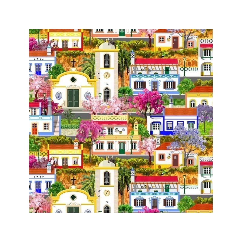 917 321 358**Tecido em half panamá de algodão inspirado no Algarve e nas suas casas típicas com as chaminés tradicionais, as amendoeiras em flor e as falésias douradas.