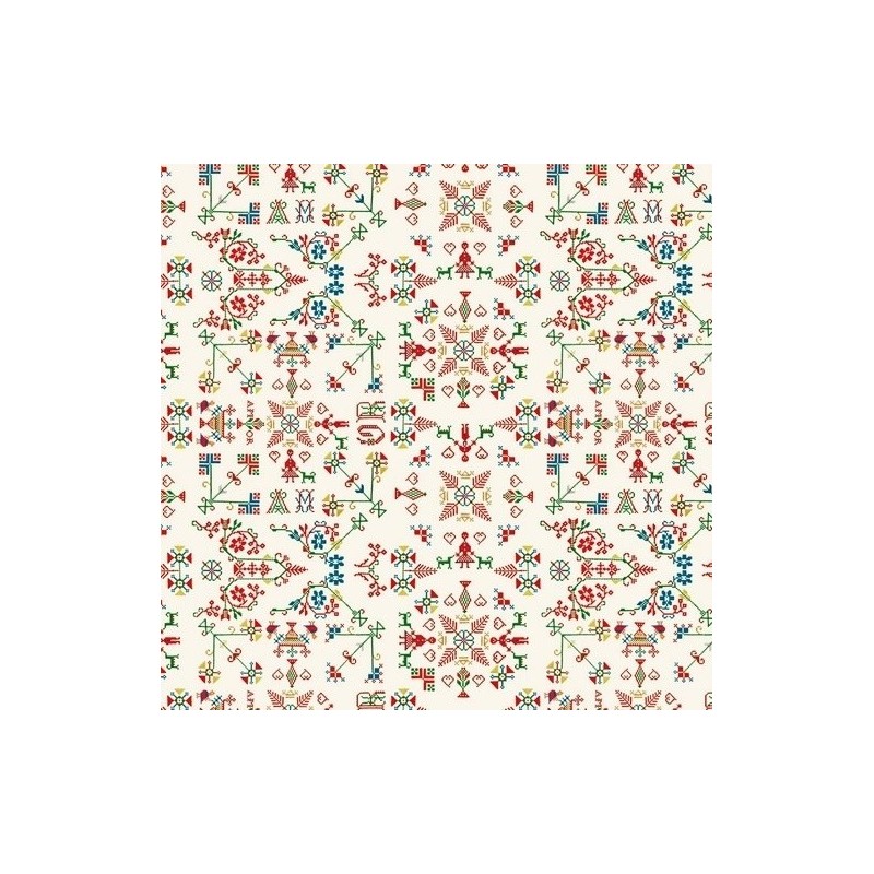 917 321 358**Tecido de estampagem digital em half-panamá de algodão de dupla largura com representação dos Lenços dos Namorados típicos do Minho, bordado pela Sra. Deolinda Antunes e reproduzido pelo estilista Fernando Rei (Tearte)