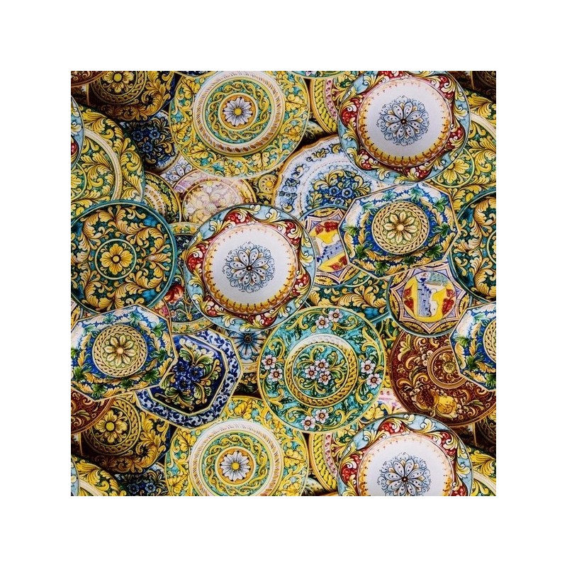 917 321 358**Tecido de estampagem digital em half-panamá de dupla largura, com pratos de cerâmica decorados em tons multicolor. Recomendado para salas, escritórios, decoração de lojas, confecção de malas e outros adereços.
