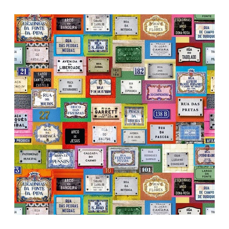 917 321 358**Tecido estampado em half-panamá de algodão orgânico biológico (cultivado sem utilização de agrotóxicos e pesticidas) de dupla largura com a representação de guitarras portuguesas com imagens típicas de temas portugueses em tons multicolor.