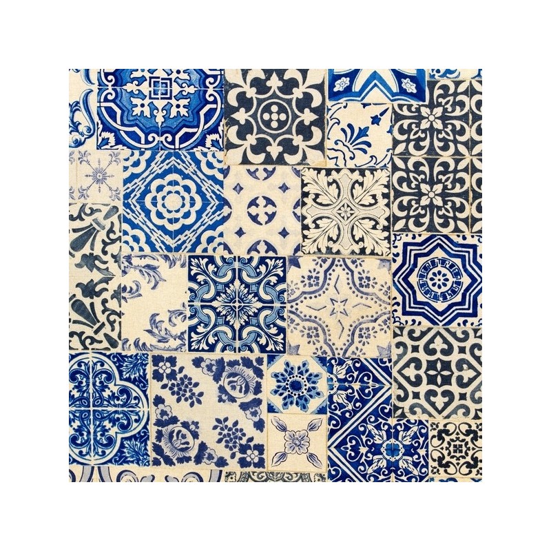 917 321 358**Tecido estampado em half-panamá de algodão de dupla largura com representação dos azulejos típicos de Portugal no tradicional tom de azul. Recomendado para salas, quartos, escritórios, decoração de lojas, aventais, toalhas de mesa de restaurantes, cafés, pastelarias ou aplicações em artesanato, souvenires, pequenas peças e outros adereços.
