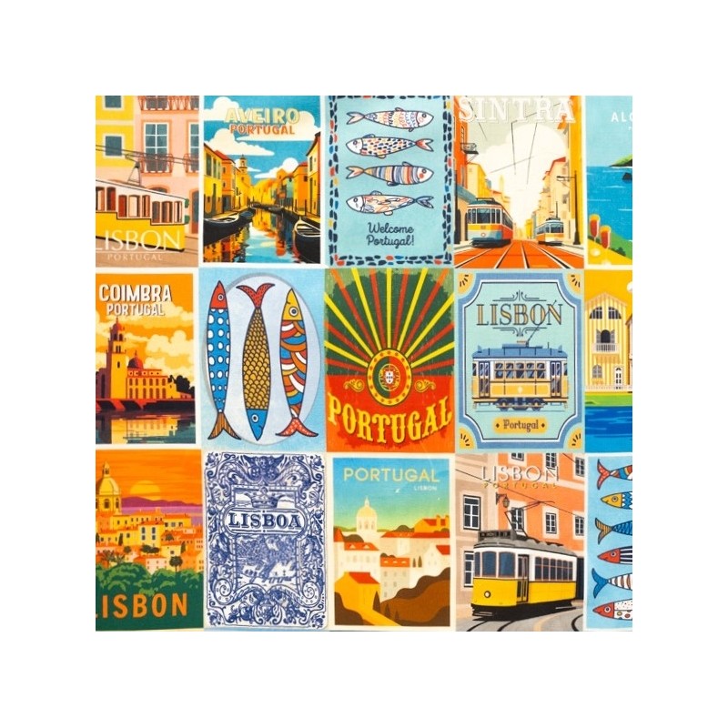 Tecido de estampagem digital em half-panamá de algodão orgânico biológico (cultivado sem utilização de agrotóxicos e pesticidas) de dupla largura com ilustrações vintage de Portugal usadas no estrangeiro para fins promocionais em tons multicolor. Recomendado para salas, quartos, escritórios, decoração de lojas, aventais, toalhas de mesa de restaurantes, cafés, pastelarias ou aplicações em artesanato, souvenires, pequenas peças e outros adereços.