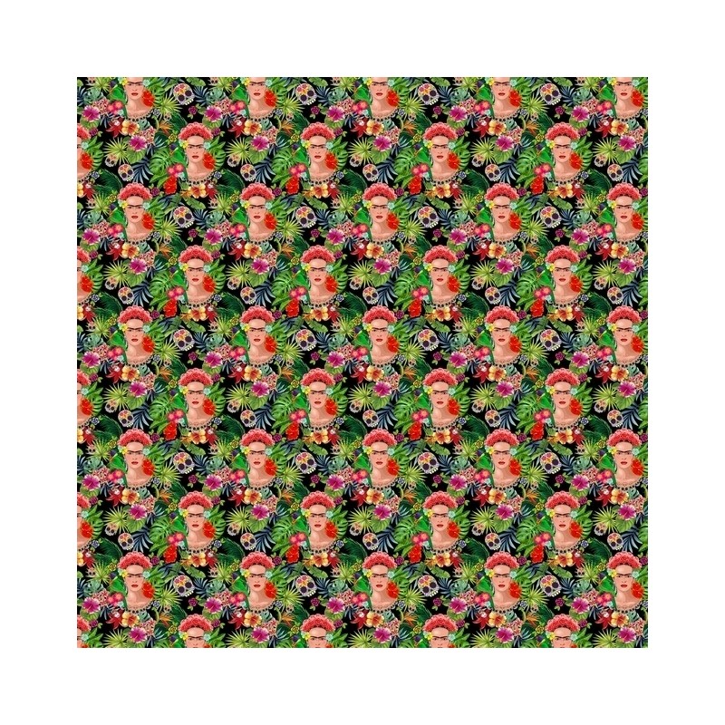 Tecido estampado em half-panamá resinado para ser repelente à água, gorduras e outros líquidos, com pequenas imagens de Frida Kahlo em tons multicolor. Recomendado sobretudo para toalhas de mesa, quer de uso doméstico, quer de cafés, bares ou restaurantes que graças ao tratamento resinado apenas necessita a passagem de um pano húmido para limpeza eficaz. Uma simples toalha de mesa poderá economizar vários milhares de litros de água durante o seu ciclo de vida.