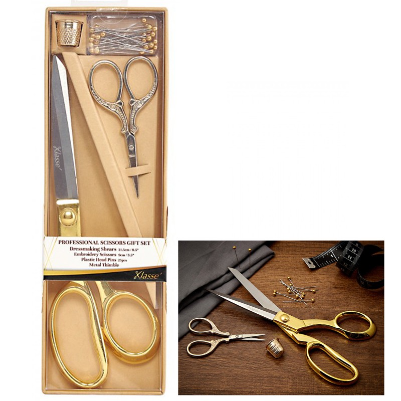 Klasse apresenta este conjunto de tesouras douradas, que contém uma tesoura de bordar, uma tesoura de alfaiate, uma caixinha com alfinetes e um dedal. Todos os acessórios têm um design muito elegante e original, que dará um toque muito chique ao seu kit de costura.