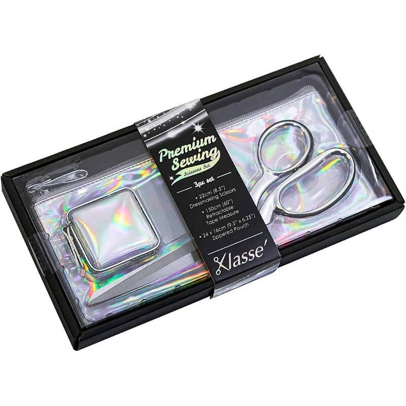 Klasse´ apresenta o conjunto de tesoura de costura e fita métrica premium , uma pequena caixa que inclui tesoura de costura de aço inoxidável e uma fita métrica, cuidadosamente armazenada numa caixa quadrada.