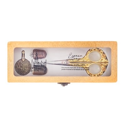Caixa de madeira com tesoura vintage Giralda se Sevilha.