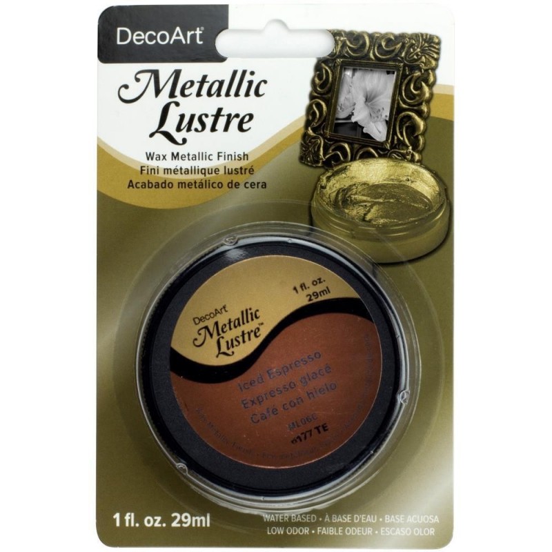 Cera Patina Mettalic Lustre - DecoArt Metallic Luster é uma cera metálica à base de água utilizada para efeito de envelhecimento nos trabalhos. Aplicar com um pano macio ou pincel sobre as superfícies. Após secagem natural, lustre com um pano macio. Pode ser alicada sobre madeira, gesso, cerâmica, MDF e couro. Pode ser utilizada para restauração de móveis.