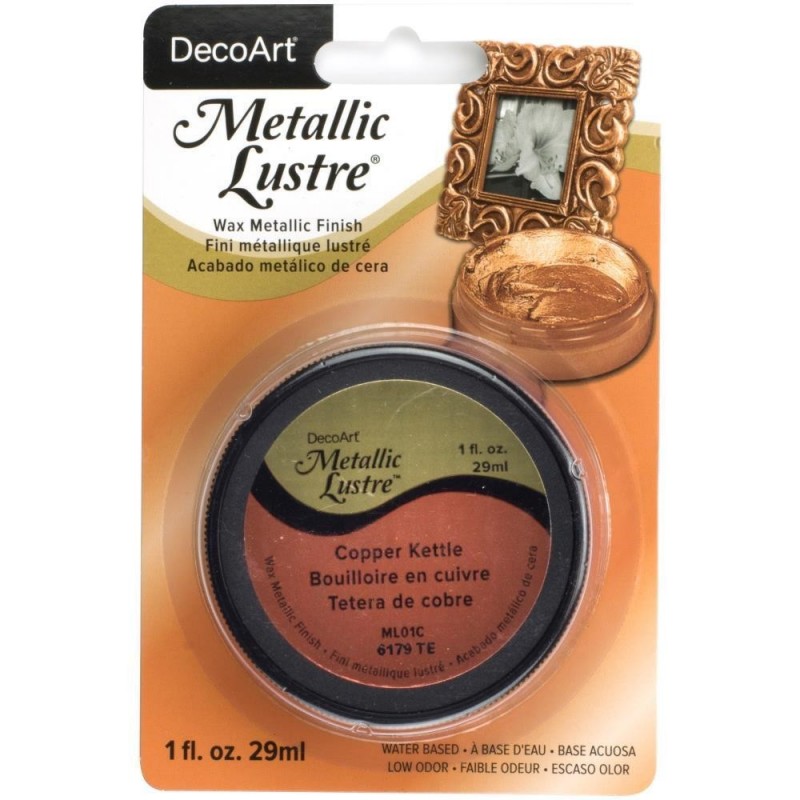 Cera Patina Mettalic Lustre - DecoArt Metallic Luster é uma cera metálica à base de água utilizada para efeito de envelhecimento nos trabalhos. Aplicar com um pano macio ou pincel sobre as superfícies. Após secagem natural, lustre com um pano macio. Pode ser alicada sobre madeira, gesso, cerâmica, MDF e couro. Pode ser utilizada para restauração de móveis.